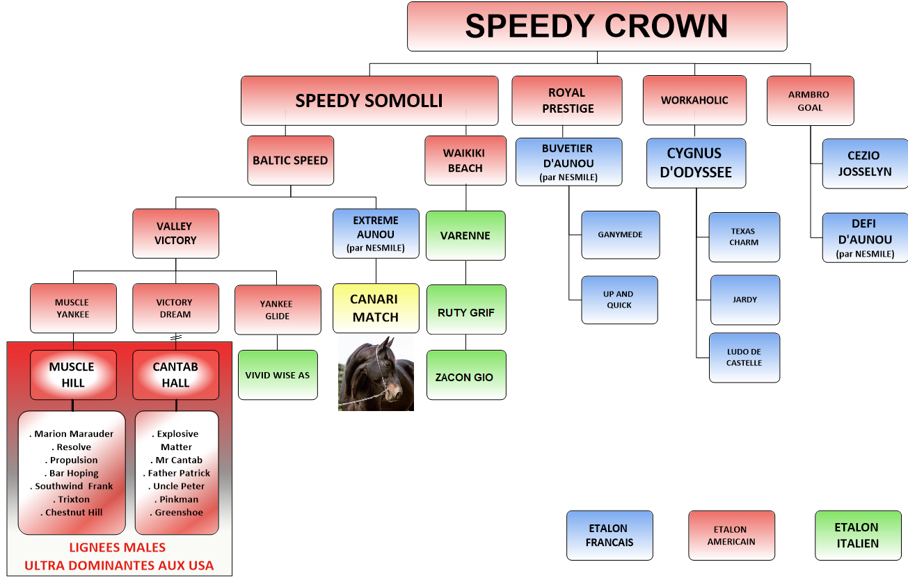 Canari Match est issu d’une grande lignée d’étalons Américains quasiment extincte en France aujourd’hui. Son père Extrême Aunou est le fruit de la dernière ouverture du StudBook TF en 1992. Il est aujourd’hui le dernier représentant de cette souche US, Canari Match représente donc un intérêt évident en termes de diversité génétique pour le studbook Trotteur Français. D’autant plus que le taux de consanguinité dans le Trotteur Français augmente significativement depuis quelques années, en l’absence d’ouverture du Studbook depuis le début des années 1990.