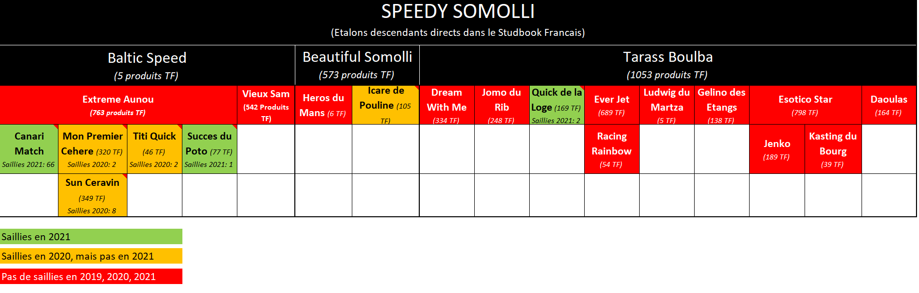 Pour le compléter, le tableau ci-dessous analyse plus en détails ce qu’il est advenu de la souche Speedy Somolli en France, et illustre parfaitement l’énorme opportunité pour un jeune étalon tout neuf comme Canari de conserver cette prestigieuse souche en France. L’arrivée de Canari Match représente donc une mini-ouverture du Studbook Français, dont bénéficient principalement les éleveurs Bretons, du fait de la situation géographique du Haras du Boulay, seul centre d’insémination TF en Bretagne.